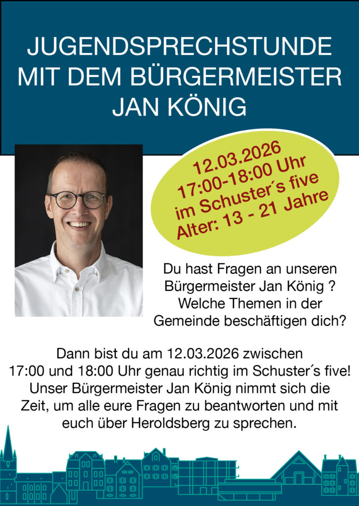Habt ihr Fragen, Ideen oder Anliegen? Nutzt die Jugendsprechstunde mit unserem Ersten Bürgermeister Jan König und bringt eure Perspektiven direkt ein. Jetzt vorbeikommen und mitgestalten!