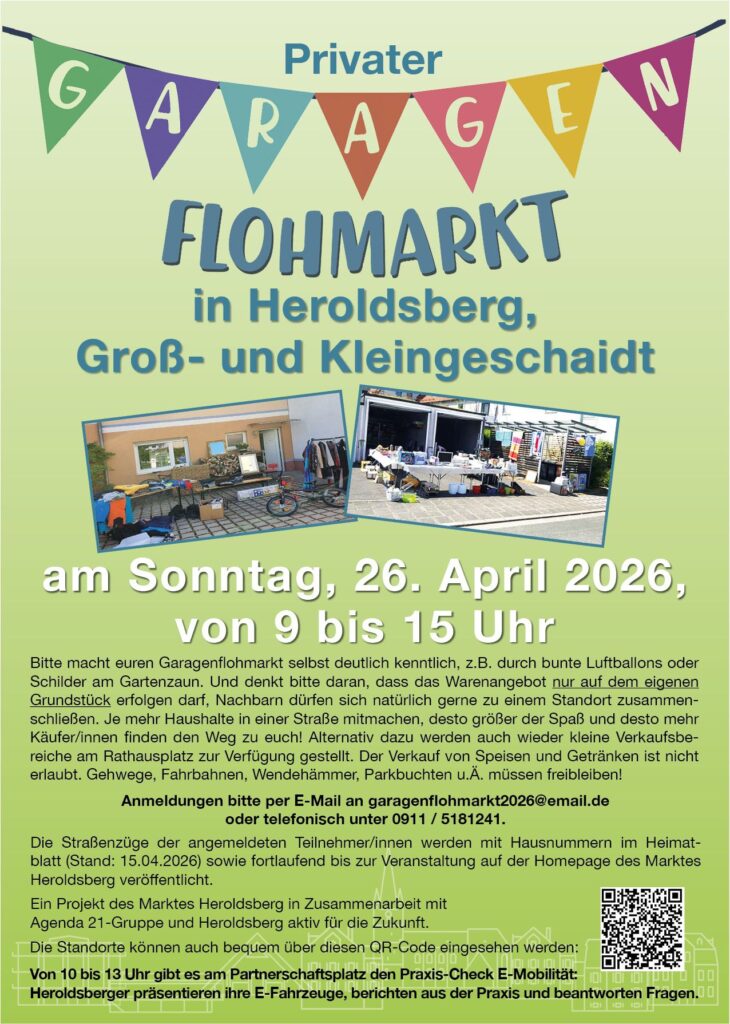 Es ist wieder so weit! Am Sonntag, den 26.April 2026, können alle großen und kleinen Bürgerinnen und Bürger aus Heroldsberg, Groß- und Kleingeschaidt, von 9 Uhr bis 15 Uhr wieder ihre Garagen und Höfe öffnen und somit den ganzen Ort in einen großen privaten Flohmarkt verwandeln. Schließt euch gerne mit euren Nachbarn zusammen. Je mehr Haushalte in einer Straße mitmachen, desto größer der Spaß und desto mehr Käufer finden den Weg zu euch. Teilnehmende aus den Ortsteilen Groß- und Kleingeschaidt sowie alle anderen Heroldsberger, die keine Garage besitzen oder zu weit „ab vom Schuss“ sind, haben in diesem Jahr wieder die Möglichkeit, einen Standplatz auf dem Rathausplatz zu reservieren. Die Plätze werden in der Reihenfolge der Anmeldung vergeben. Die Plätze sind oben genannten Zielgruppen vorbehalten und für die Teilnehmenden gebührenfrei. Spenden für „Heroldsberg, aktiv für die Zukunft“ und für die „AGENDA 21 Heroldsberg“ zur Unterstützung unserer Projekte, nehmen wir natürlich gerne an. Der Aufbau am Rathausplatz kann ab 8 Uhr beginnen, Ansprechpartner werden vor Ort sein. Alle weiteren Details können wir gerne bei der Anmeldung klären. Wenn Ihr am Garagenflohmarkt teilnehmen möchtet, sendet uns bitte eine E-Mail mit Namen und Adresse an: garagenflohmarkt2026@email.de Selbstverständlich ist auch eine telefonische Anmeldung möglich: Tel. 0911/518 12 41. Die teilnehmenden Haushalte werden ausschließlich mit Straße und Hausnummer fortlaufend bis zur Veranstaltung in einem virtuellen Ortsplan auf „Heroldsberg.de“ und auf der „Heimat-Info-App“ veröffentlicht. Solltet Ihr mit der Veröffentlichung nicht einverstanden sein, teilt uns das bitte schriftlich mit. Bitte macht euren Garagenflohmarkt selbst deutlich kenntlich, z.B. durch bunte Luftballons oder Schilder am Gartenzaun. Und denkt daran, dass das Warenangebot nur auf dem eigenen Grundstück erfolgen darf. Öffentliche Parkplätze und Gehwege müssen frei bleiben. Gewerblicher Verkauf sowie der Verkauf von Speisen und Getränken ist bei dieser Veranstaltung nicht erlaubt. Viel Spaß und Erfolg beim Verkaufen und Stöbern wünscht Agenda 21 Heroldsberg und Heroldsberg, aktiv für die Zukunft Hinweis: Zur gleichen Zeit findet auf dem Partnerschaftsplatz eine Ausstellung von E-Autos statt. |