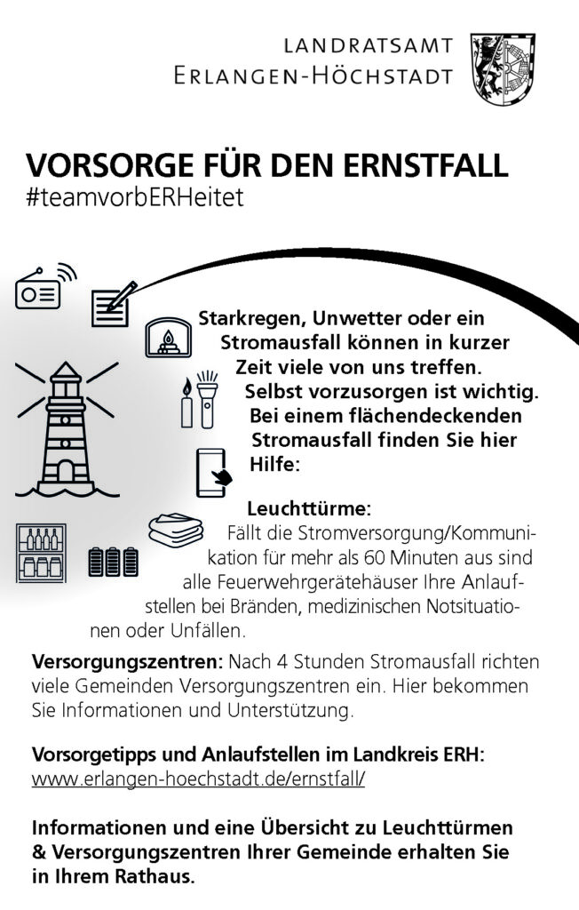 Bitte beachten Sie, dass wir Sie mit diesen Informationen keinesfalls beunruhigen oder in Panik versetzen wollen. Es geht in erster Linie darum, Sie darüber sachlich zu informieren, dass wir alles in unserer Macht stehende tun werden, um für den Ernstfalls bestmöglich gerüstet zu sein. Auch in den kommenden Monaten werden wir Sie über das Heroldsberger Heimatblatt weiterhin über aktuelle Sachstände informieren oder zu einzelnen Bereichen detailliertere Ausführungen machen. Wir bitten Sie daher, das Heimatblatt in den nächsten Monaten aufmerksam zu lesen und sich die eine oder andere Information, die möglicherweise für Sie relevant wäre, zu verinnerlichen.