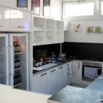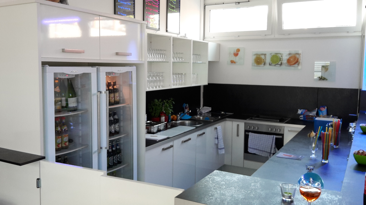 Herd und Backofen, Kühl- und Gefrierschrank, Flaschenkühlauszüge, Lagerflächen, Geschirr- und Gläserspüle, Geschirr, Gläsern und Besteck