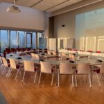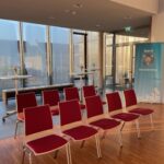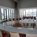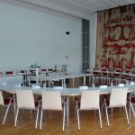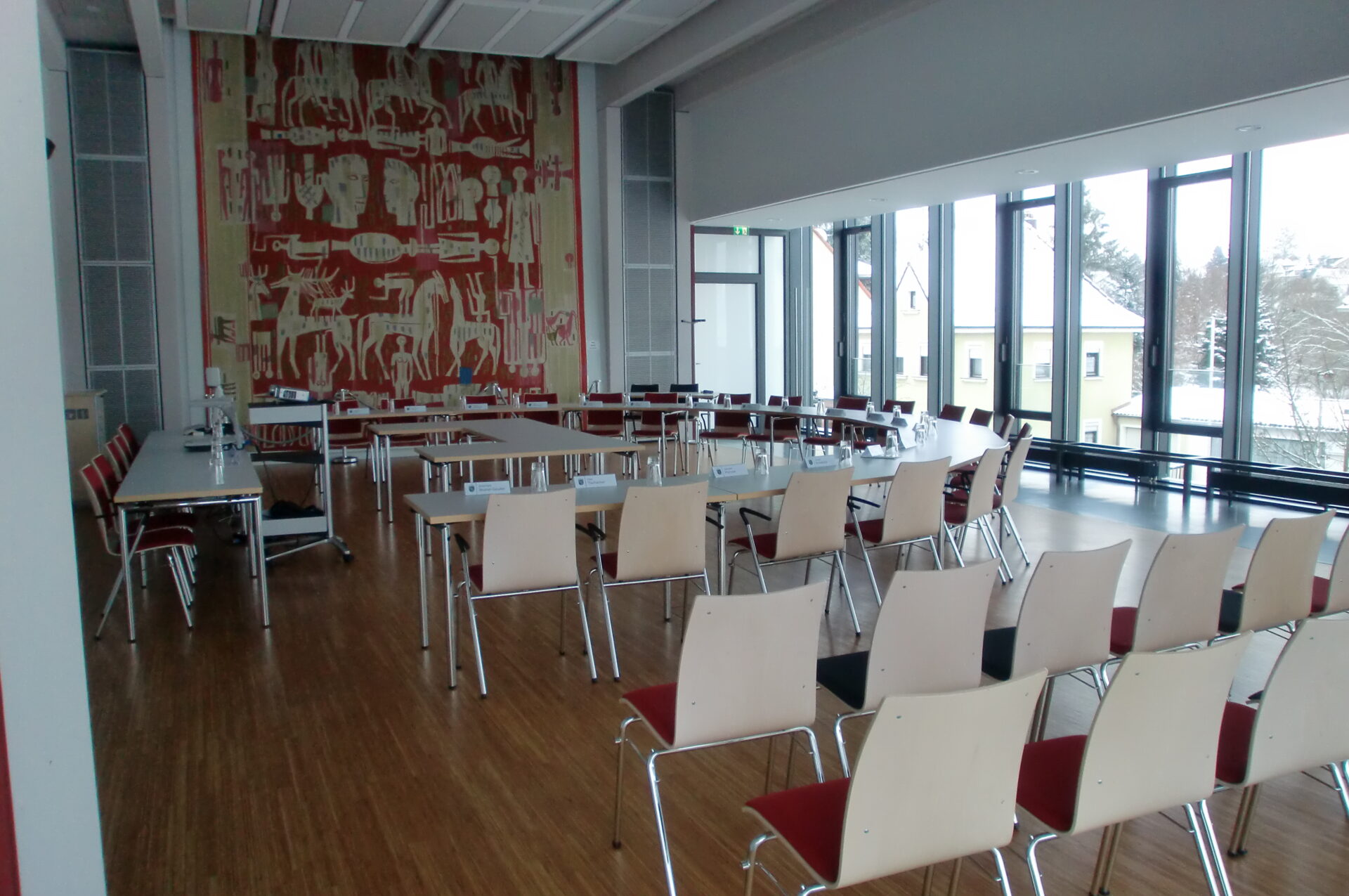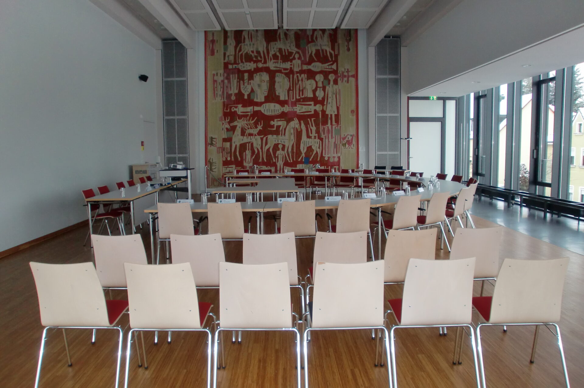 Der Sitzungssaal bietet eine Plenarausstattung mit halbkreisförmiger Tischordnung mit 20 Armlehnstühlen und stirnseitig 6 – 8 Präsidiumsplätzen an einer Tischanlage für Referenten.